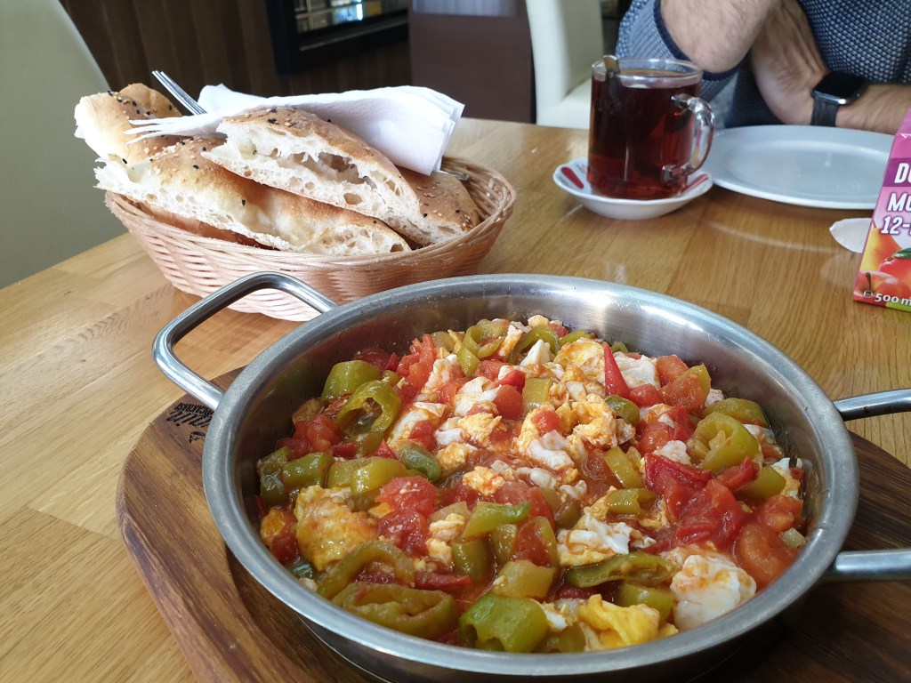 Für einmal möchte ich euch jetzt nichts über die sehr leckeren (wenn mir auch etwas zu süßen) Baklava oder die anderen Leckereien erzählen, die dort aufgetischt werden. Nein. Es gibt eine andere Sache, wegen der ich regelmäßig dort zu Gast bin. Das Frühstück. Und zwar genauer gesagt Menemen, das ist Rührei mit Paprika und Tomaten, das dort – zusammen mit einem Glas Schwarztee – serviert wird. Es wird in einem kleinen gusseisernen Pfännchen serviert, mit einer Menge Fladenbrot dazu und ist einfach perfekt. Momentan wird der Gastraum ausgebaut, damit mehr Tische Platz finden.